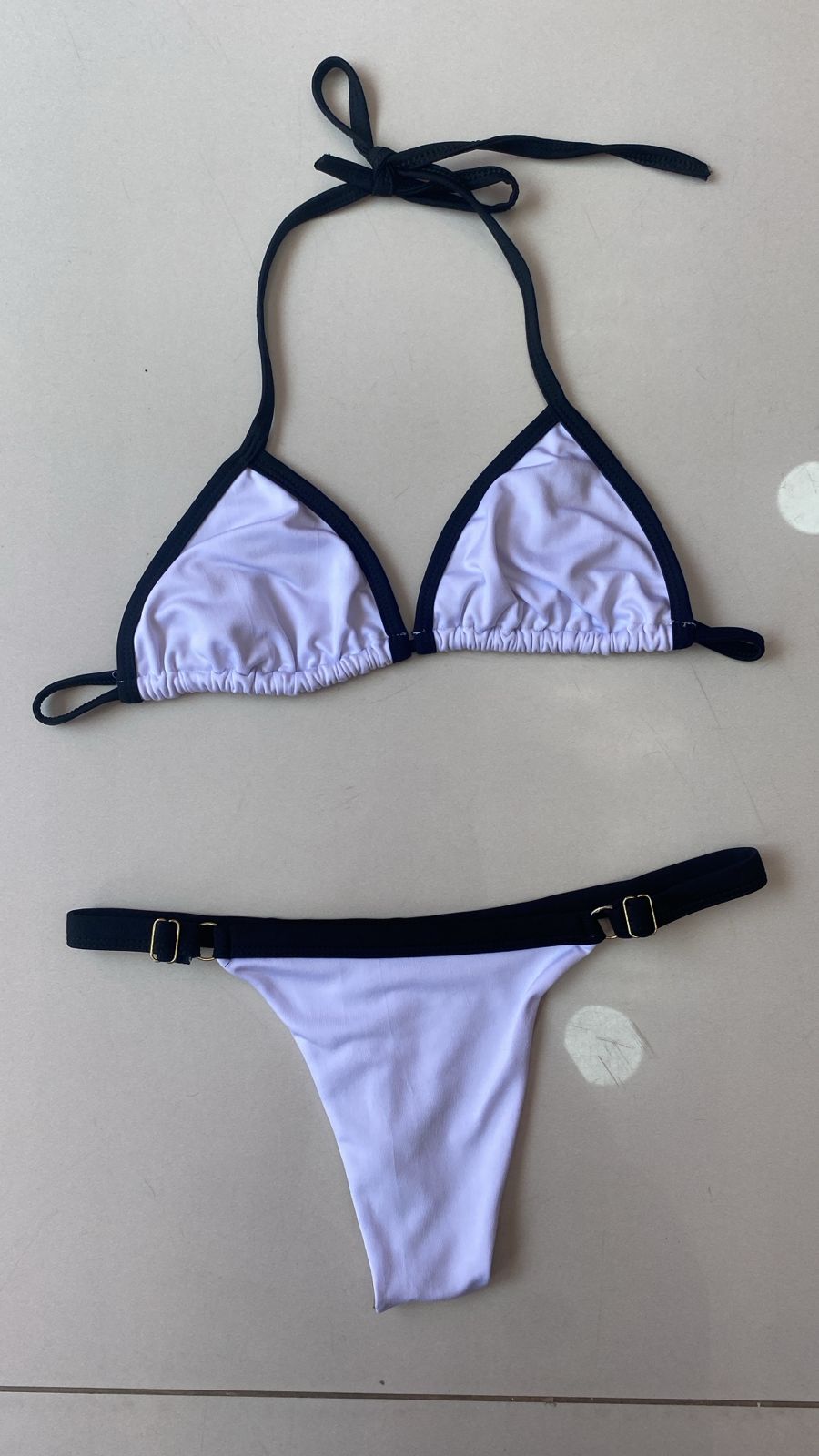 Este biquíni encanta pelo contraste marcante entre o preto azulado profundo e os detalhes blancos que delineiam as bordas e as amarrações finas, criando um efeito visual moderno e vibrante. A textura lisa e o acabamento fosco do tecido não só valorizam a pele como também asseguram uma aparência sofisticada. O design privilegiado prioritiza o minimalismo, com tiras delicadas que adicionam leveza e charme, resultando em uma peça atemporal que se destaca pela simplicidade e cuidado nos detalhes.