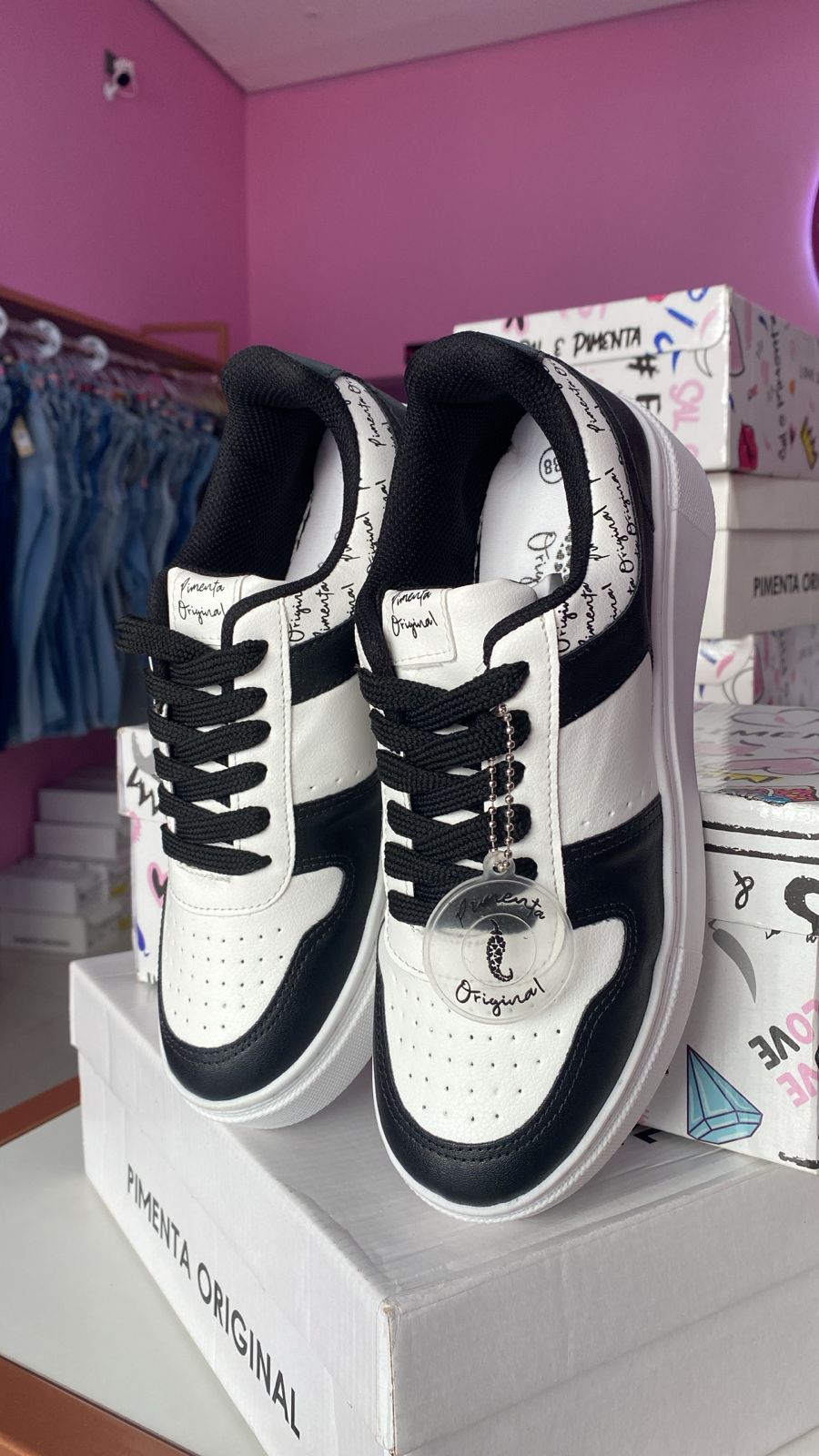 Com uma combinação clássica de preto e branco e acabamento fosco, este tênis imprime sofisticação sem esforço. O contraste entre o preto que reveste as laterais, calcanhar e biqueira e o fundo branco cria um balanço visual marcante e elegante. Além disso, o topo apresenta um padrão perfurado que, além de funcional, traz um toque de leveza ao design, destacando a ventilação contínua que seus pés merecem. O toque final fica para a etiqueta “Pimenta Original”, uma assinatura transparente presa ao cadarço preto, que não apenas reforça a exclusividade, mas se torna um símbolo de estilo autêntico e moderno.