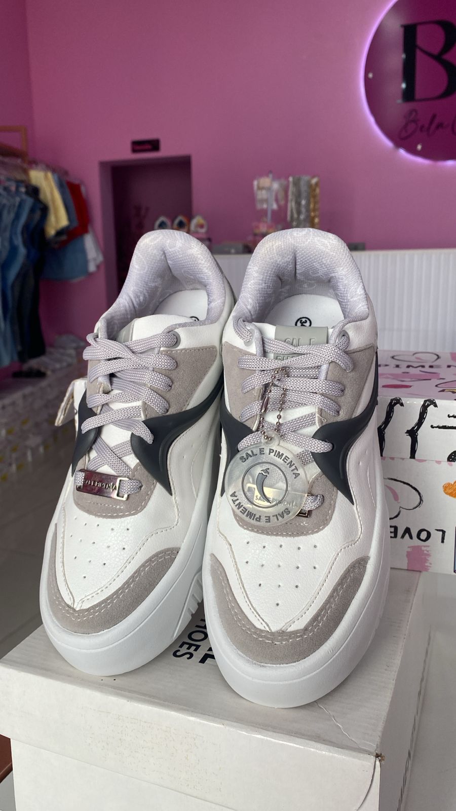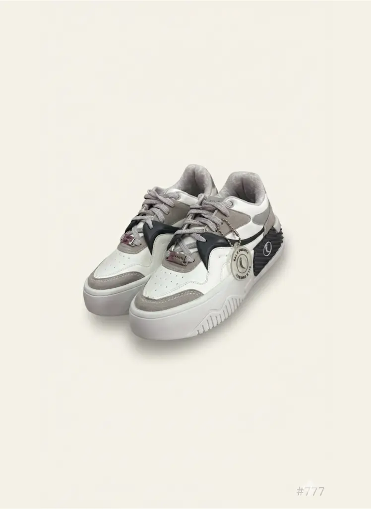 O Tênis Sal e Pimenta se destaca pelo seu visual sofisticado, combinando o branco brilhante com detalhes em cinza aveludado que conferem uma textura suave ao toque. O preto fosco, presente no suporte dos cadarços e no logotipo lateral, acrescenta um contraste elegante e moderno, criando um design equilibrado e contemporâneo. Para finalizar, a placa metálica prateada com o nome da marca na parte frontal e o logotipo em relevo próximo ao calcanhar são verdadeiros símbolos de originalidade e exclusividade que destacam a personalidade do produto.
